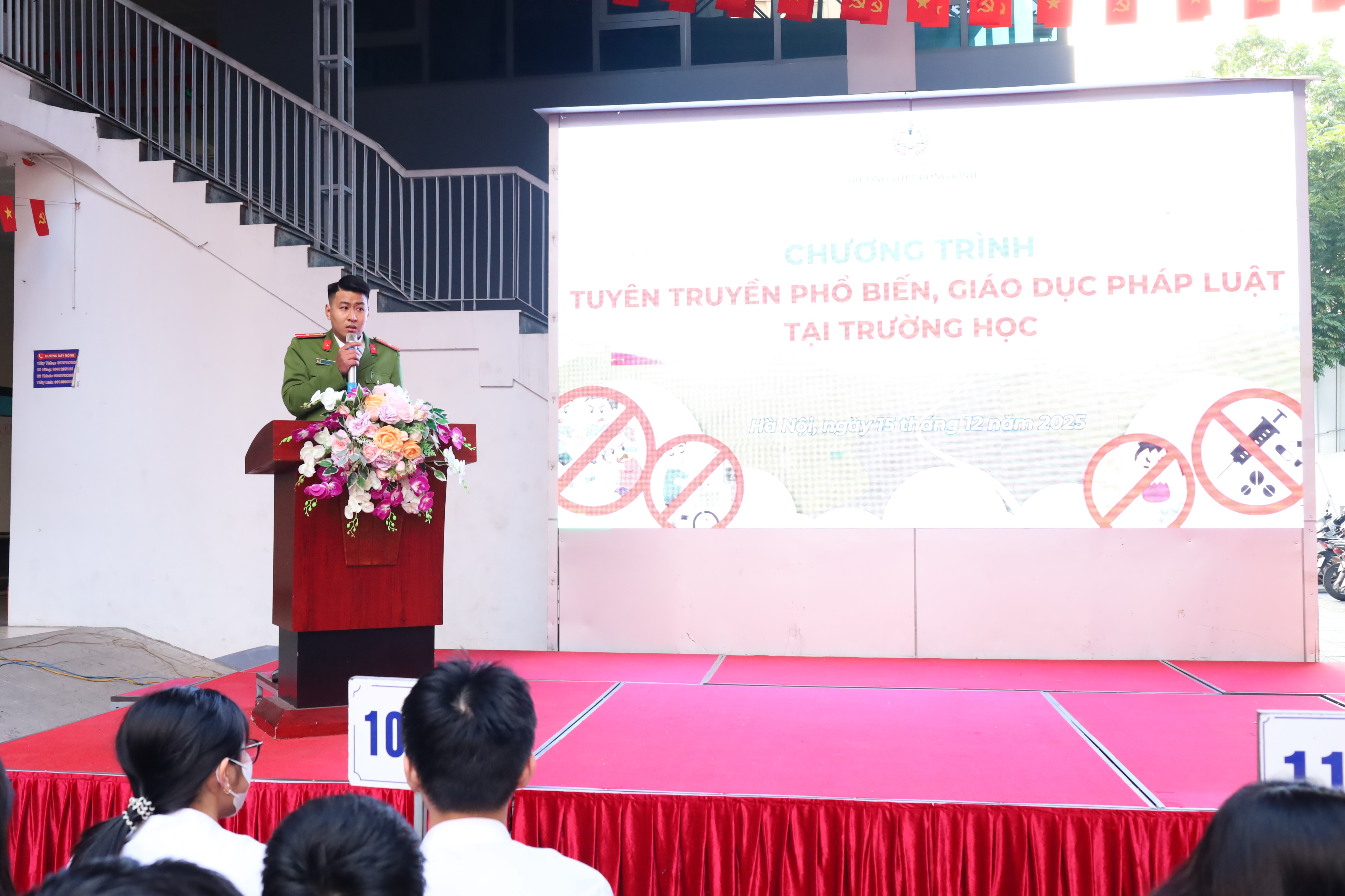 Thực hiện Công văn 565/PC02-Đ4 ngày 25/11/2025 của Công an TP Hà Nội về việc tổ chức tuyên truyền, phổ biến giáo dục pháp luật cho học sinh, trong đó, trọng tâm là chủ đề “Thanh thiếu niên vi phạm giao thông, gây rối trật tự công cộng - cần ngăn chặn từ gốc”, chiều 15/12/2025, Công an phường Tương Mai đã phối hợp với Trường THPT Đông Kinh tổ chức buổi tuyên truyền pháp luật cho học sinh nhà trường.
